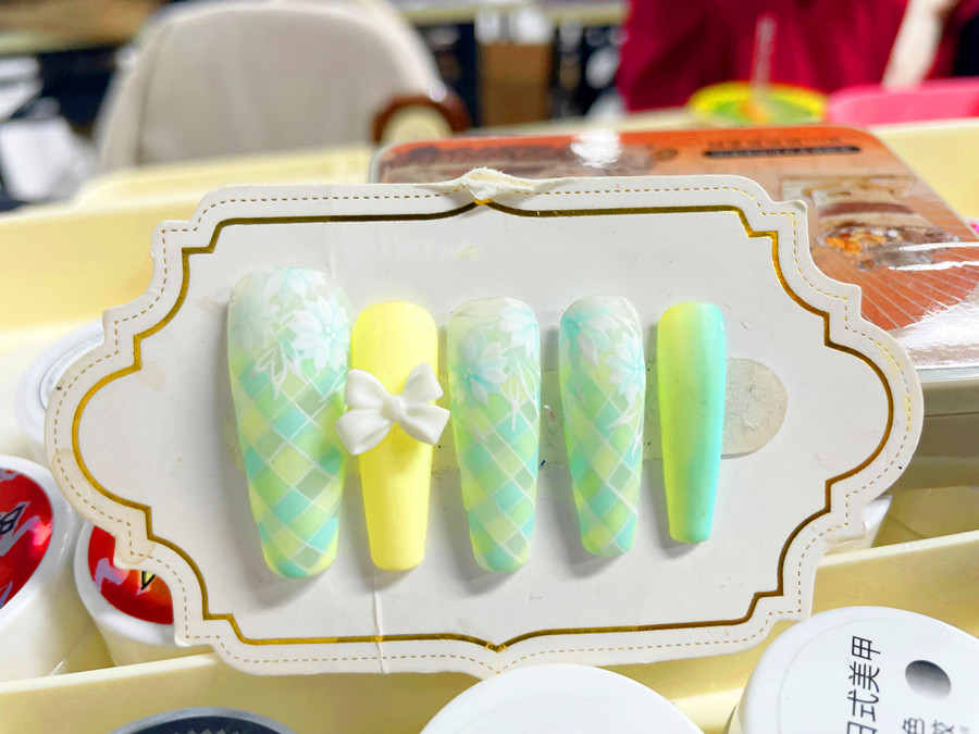 廣西美甲學(xué)習(xí)中心、廣西美甲進(jìn)修提升作品解析:作品以白色、薄荷綠以及檸檬黃三種顏色為主。先用乳白色甲油膠作為底色,然后再用彩繪筆畫出格紋線條,并以不規(guī)則的方式用薄荷綠以及檸檬黃兩種顏色進(jìn)行填充。之后在畫出白色的小雛菊作為主花,在檸檬黃甲片上粘貼蝴蝶結(jié)視頻,使得整副作品春意盎然,氛圍感十足!